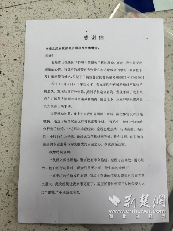 Jingchu.com(Hubei Daily)新闻(通讯范Liwen和Xie Bowen)最近在Xiangyang的Oct Resort旅行时意外失去了手机。后来,他发现他的手机被带到南县县的Wu'an Town。 Nanzhang县公共安全局Wu'an镇警察局的警察迅速做出了回应,并进行了详细的调查,成功地帮助游客恢复了手机。 8月11日,深入的游客向警察专业人士表示感谢。