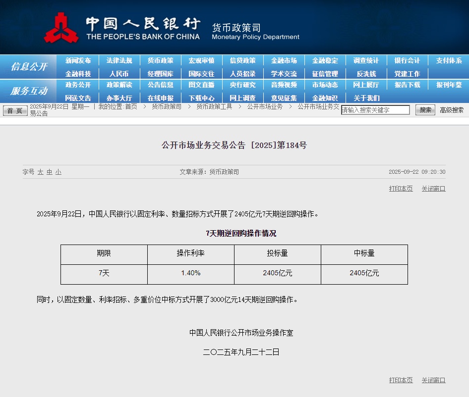 中国人民银行网站的屏幕截图。 《人民日报》,北京,9月22日(记者luo Zhizhi)根据中国人民网站,中国人民银行对2405亿元人民币的运营进行了7天的逆向续约,并以固定的利率和当今的竞标量进行了固定利率和数量。同时,在固定数量,竞标利率和许多竞标中赢得价格的14天反向重新购买运营进行了3000亿元。